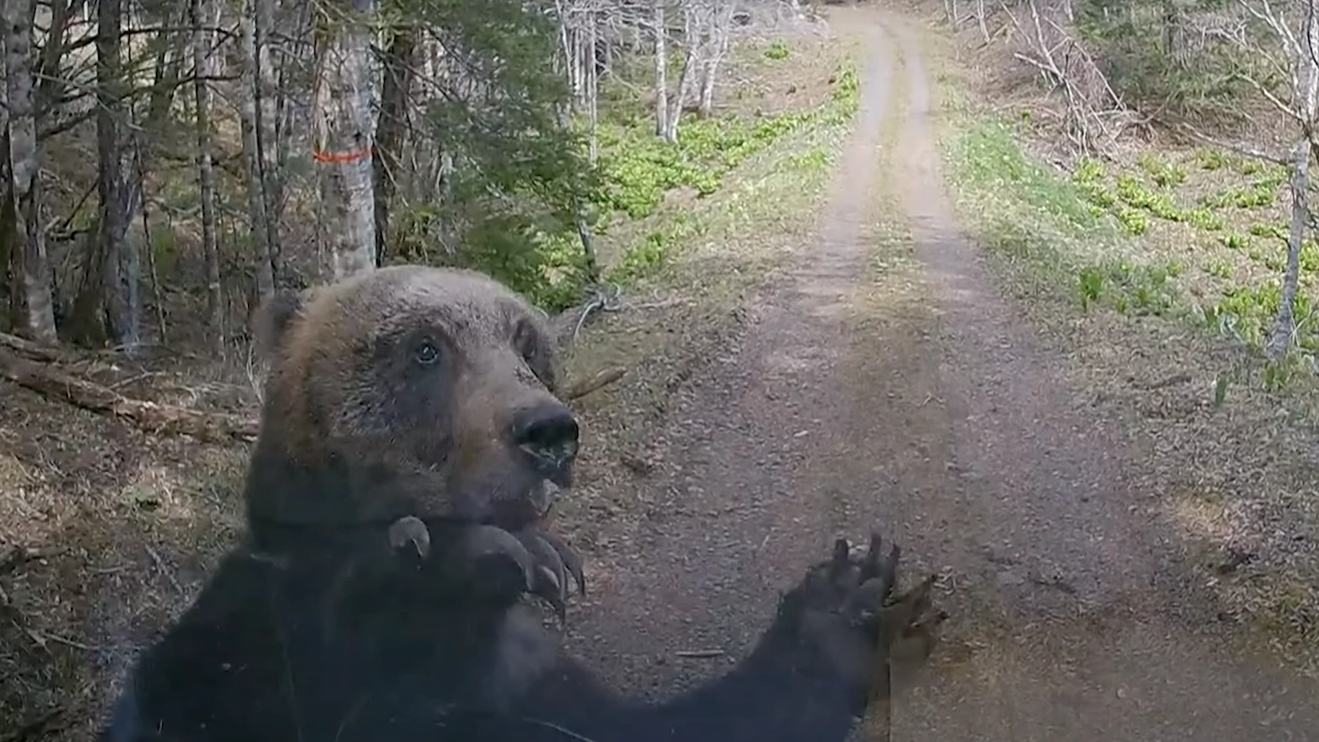 Mama bear runs headlong into a truck she thinks is endangering her cubs